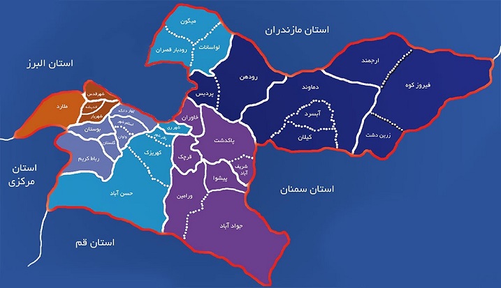 شمال:از شمال به مرز جغرافیایی استان مازندران منتهی شده است و شامل محدوده های: فیروزکوه،ارجمند، زرین دشت، دماوند،آبسرد، کیلان، رودهن،پردیس،لواسانات،میگون و رودبار قصران است.