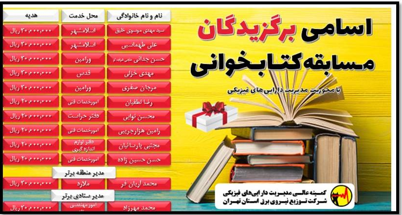 اولین مسابقه بزرگ کتابخوانی با محوریت مدیریت داراییهای فیزیکی به مناسب ایام ا... دهه فجر انقلاب اسلامی در شرکت توزیع نیروی برق استان تهران برگزار گردید.