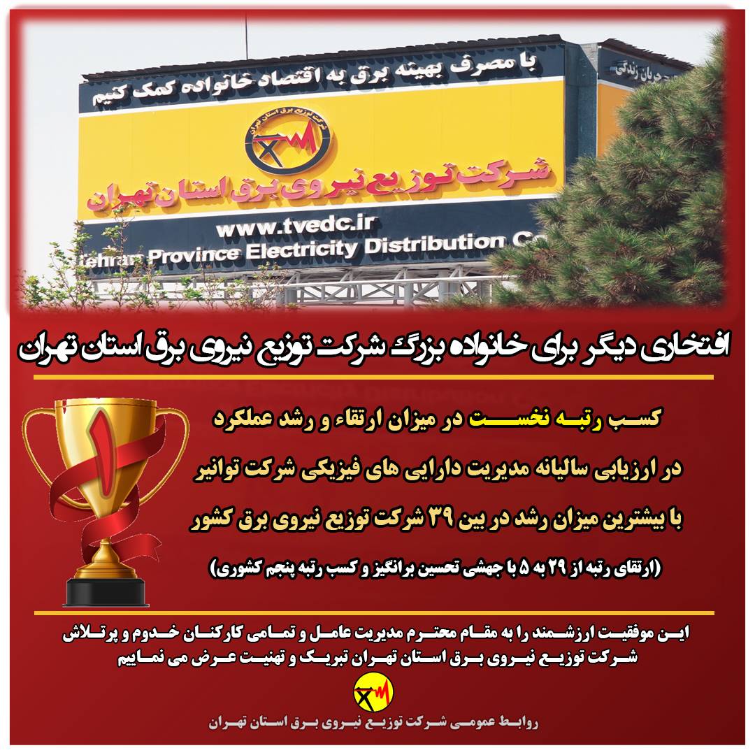افتخاری دیگر در کارنامه فعالیتهای شرکت توزیع نیروی برق استان تهران به ثبت رسید. شرکت توزیع نیروی برق استان تهران به سبب ارتقا و رشد عملکرد در ارزیابی سالیانه مدیریت داراییهای فیزیکی شرکت توانیر، با بیشترین میزان رشد در بین ۳۹ شرکت توزیع نیروی برق کشور رتبه نخست را به خود اختصاص داد و رتبه ارزیابی این حوزه، از رتبه 29 در ارزیابی سال گذشته به رتبه 5 کشوری ارتقاء یافت. این موفقیت ارزشمند را به جناب آقای مهندس حسن بکلو مدیرعامل محترم شرکت و تمامی همکاران متعهد و پرتلاش شرکت تبریک می گوییم.
